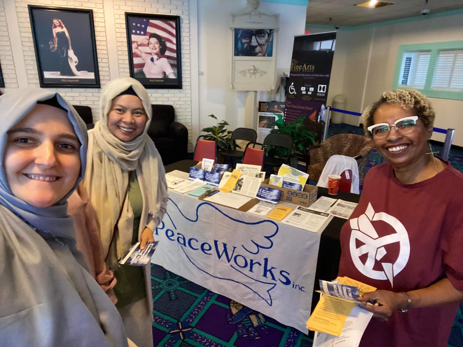Merve Esen, a friend, and Debora Demeter tabling for Peaceworks Kansas City at a showing of the film Oppenheimer. Photo by Merve Esen.