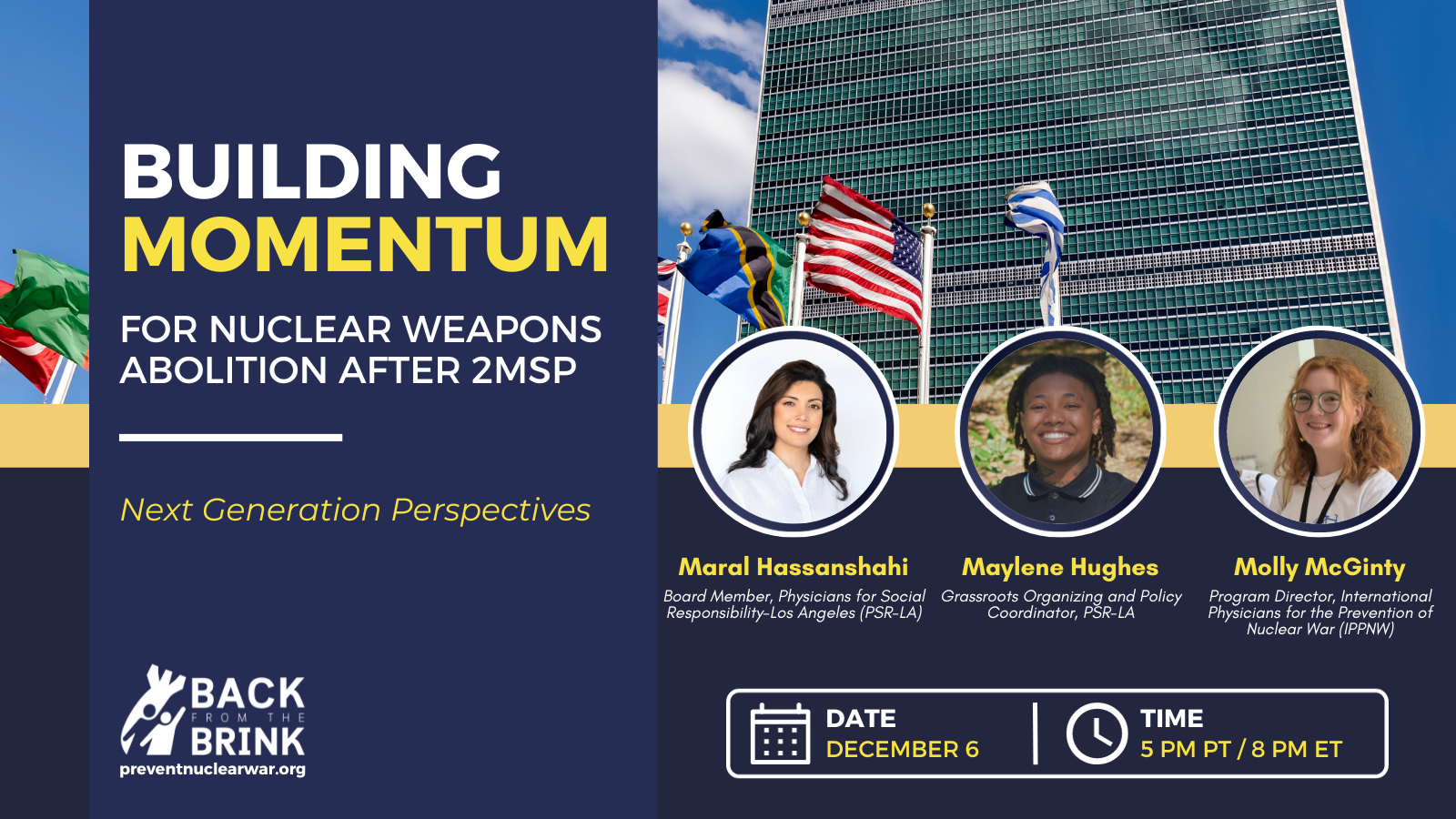 Back from the Brink is excited to invite you to Building Momentum for Nuclear Weapons Abolition After 2MSP: Next Generation Perspectives to share with you some of the ideas and energy coming out of the Second Meeting of States Parties (2MSP) to the Treaty on the Prohibition of Nuclear Weapons. This virtual event on Wednesday, December 6th at 8 pm ET / 5 pm PT will feature a roundtable discussion among next generation nuclear disarmament advocates who will have just returned from the 2MSP in New York City.